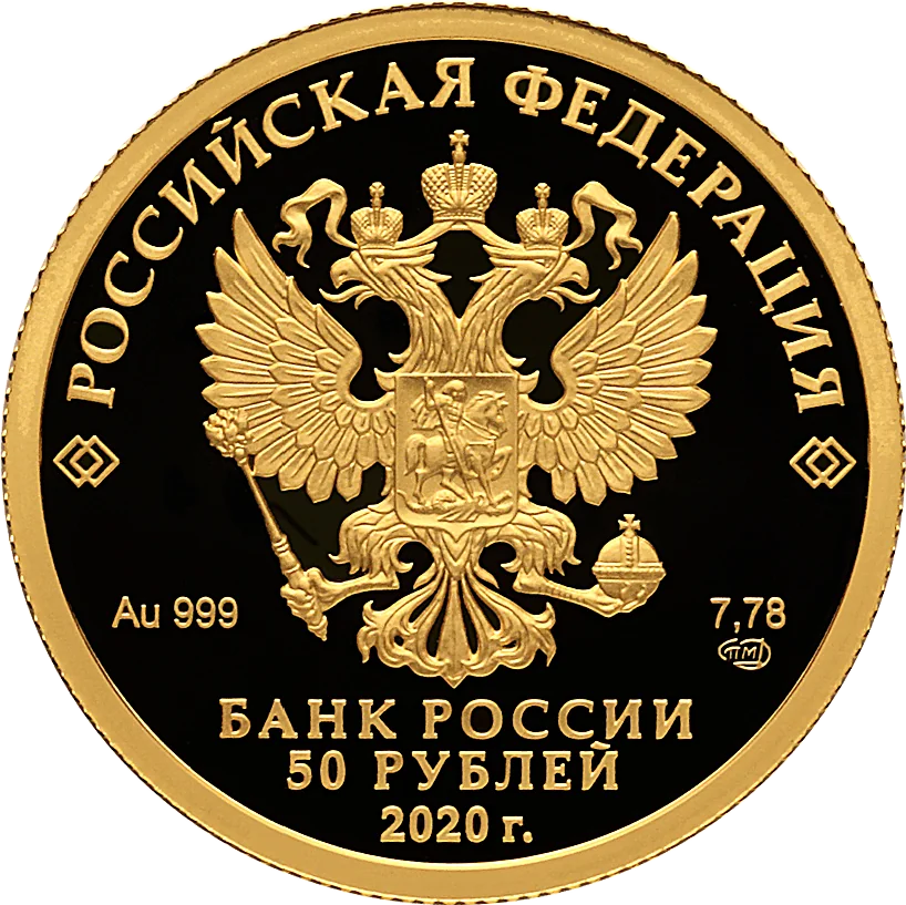 The disc's mirror field features the Russian Federation coat of arms. Above it, along the rim, is the semicircular inscription "РОССИЙСКАЯ ФЕДЕРАЦИЯ," flanked by doubled rhombuses. Below the coat of arms are the metal/fineness on the left and the fine metal content/mint mark on the right. Centered at the bottom, in three lines, are the inscriptions "БАНК РОССИИ," the denomination, and the year "2020 г."