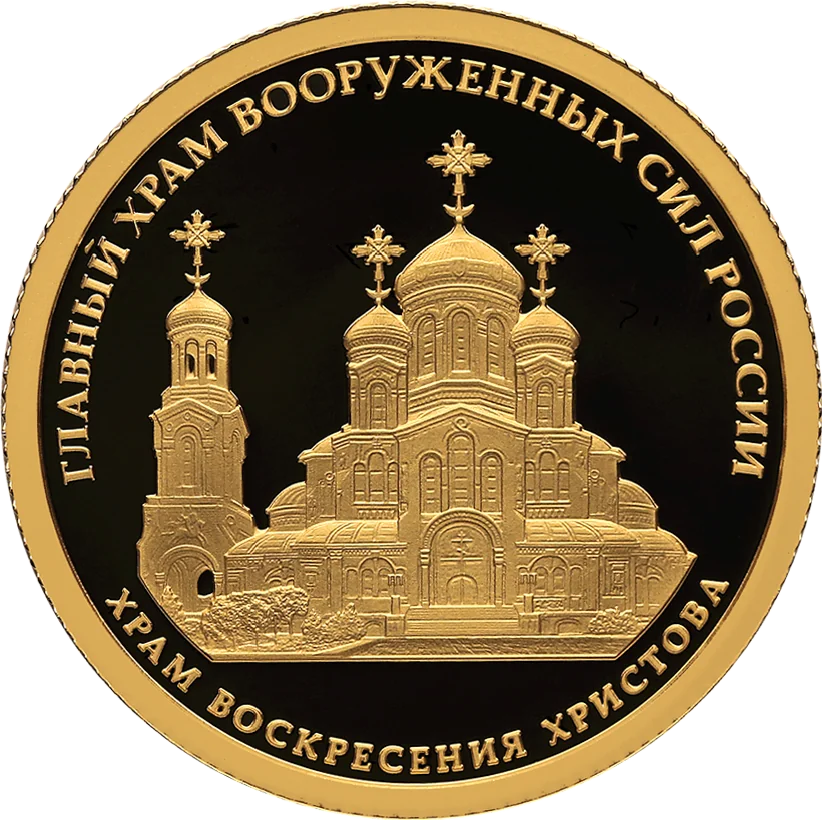 The disc's mirror field shows a relief of the Church of the Resurrection of Jesus Christ, encircled by the inscriptions: ‘ГЛАВНЫЙ ХРАМ ВООРУЖЕННЫХ СИЛ РОССИИ’ above and ‘ХРАМ ВОСКРЕСЕНИЯ ХРИСТОВА’ below.