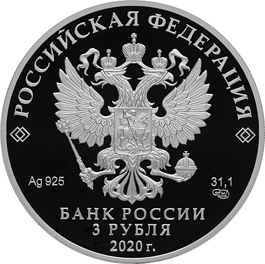 The obverse features the Russian Federation coat of arms with the inscription "РОССИЙСКАЯ ФЕДЕРАЦИЯ" above. Below are the metal specifications and mint mark, with "БАНК РОССИИ", "3 РУБЛЯ", and "2020 г." at the bottom.