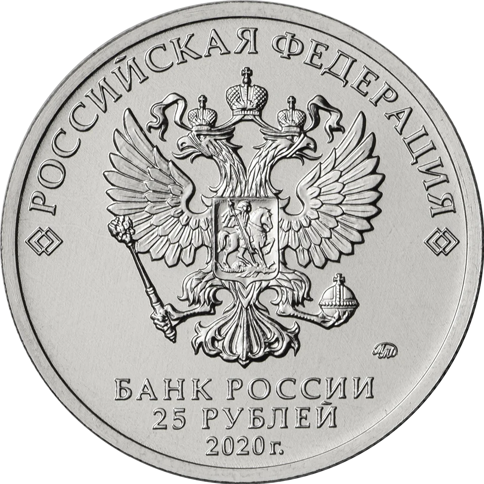 Centered is the national coat of arms, above it a semicircular inscription: "РОССИЙСКАЯ ФЕДЕРАЦИЯ", flanked by doubled rhombuses. Below are "БАНК РОССИИ", "25 РУБЛЕЙ", "2020 г.", and on the right, the mint mark.