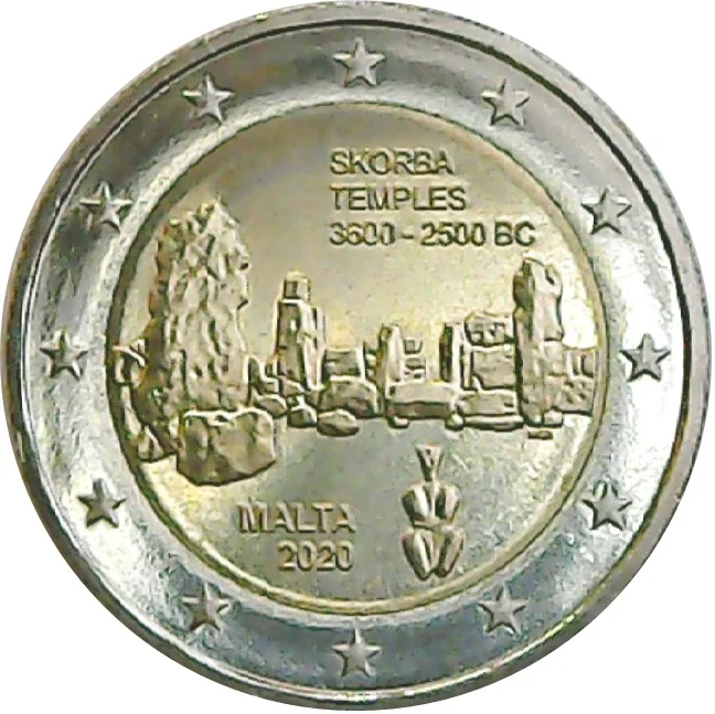 Skorba, a prehistoric temple complex near Zebbiegh, Malta, consists of two adjacent temples built upon an older settlement. Though less monumental than other Maltese temples, it was crucial for establishing the islands' prehistoric sequence, showing habitation from around 5000 BC. The design includes the inscription 'SKORBA TEMPLES 3600-2500 BC', 'MALTA', and '2020', surrounded by the 12 stars of the European flag.