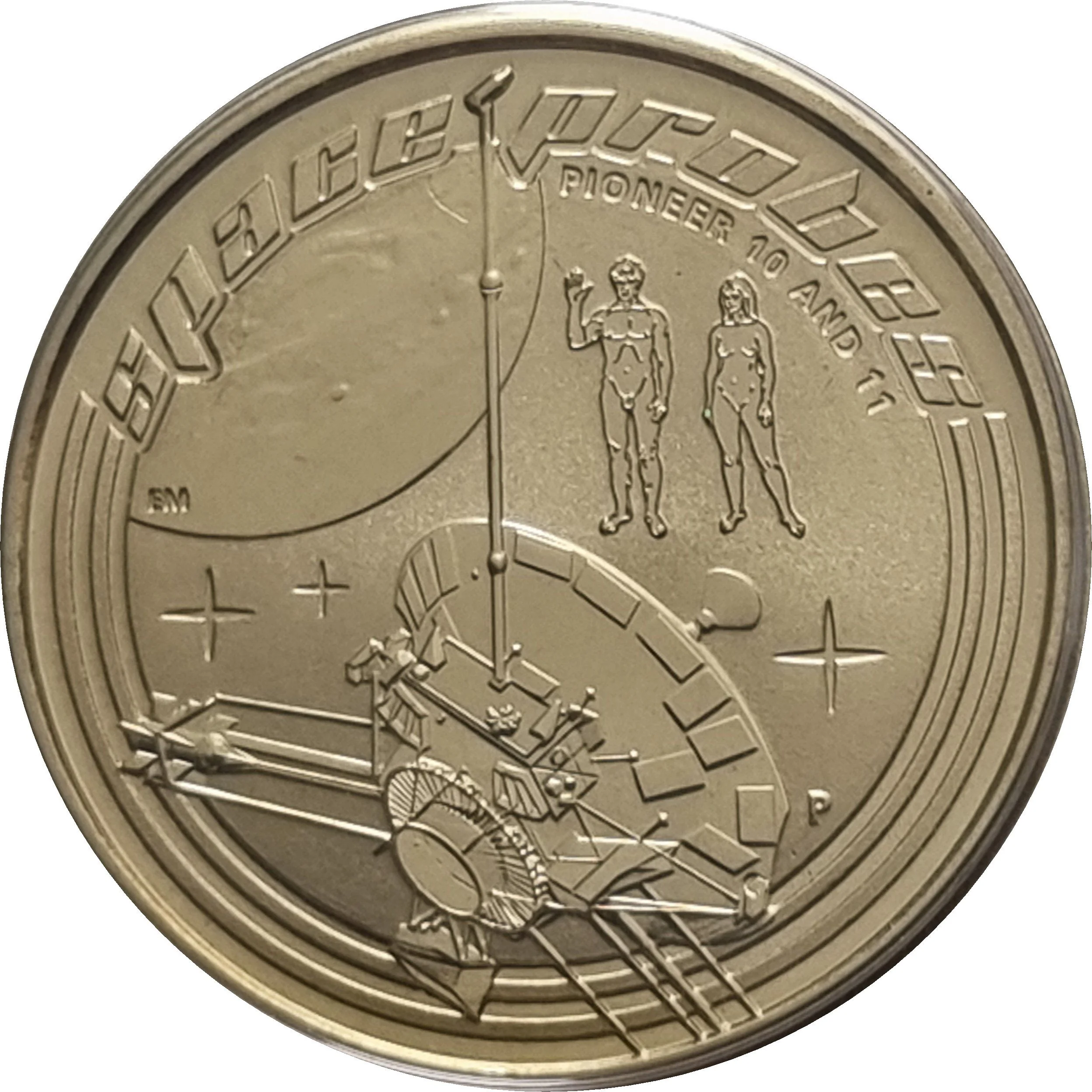 Pioneer 10 probe. A planet above, a naked man and woman waving.