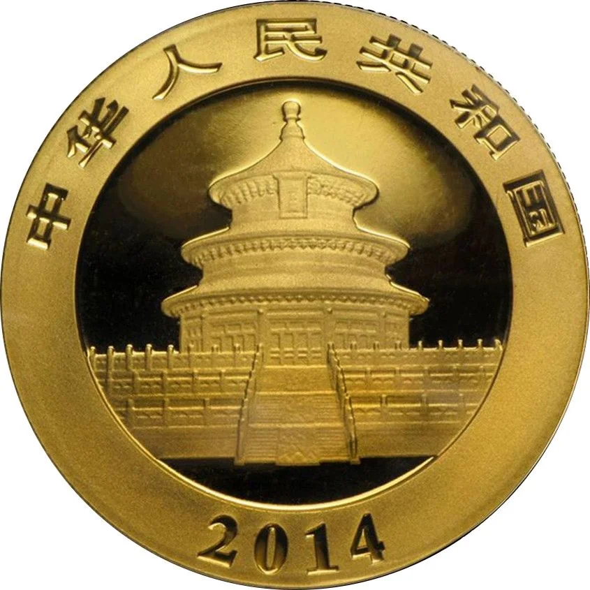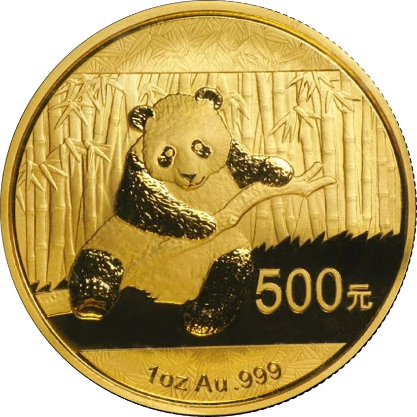 A sitting panda plays with a branch against a bamboo forest, alongside the coin's denomination, weight, and purity.