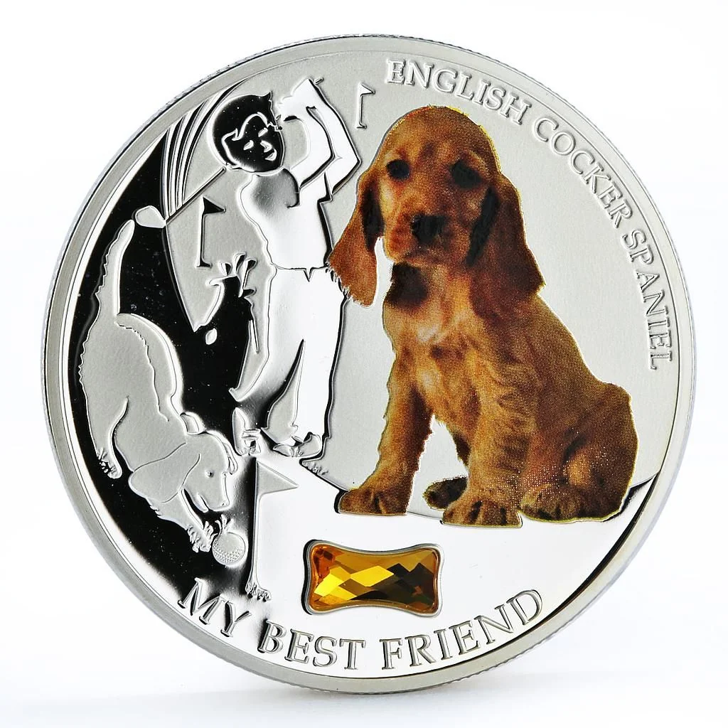 A cocker spaniel on a colorful seat, a child golfing with the dog, and a yellow inlaid bone stone.