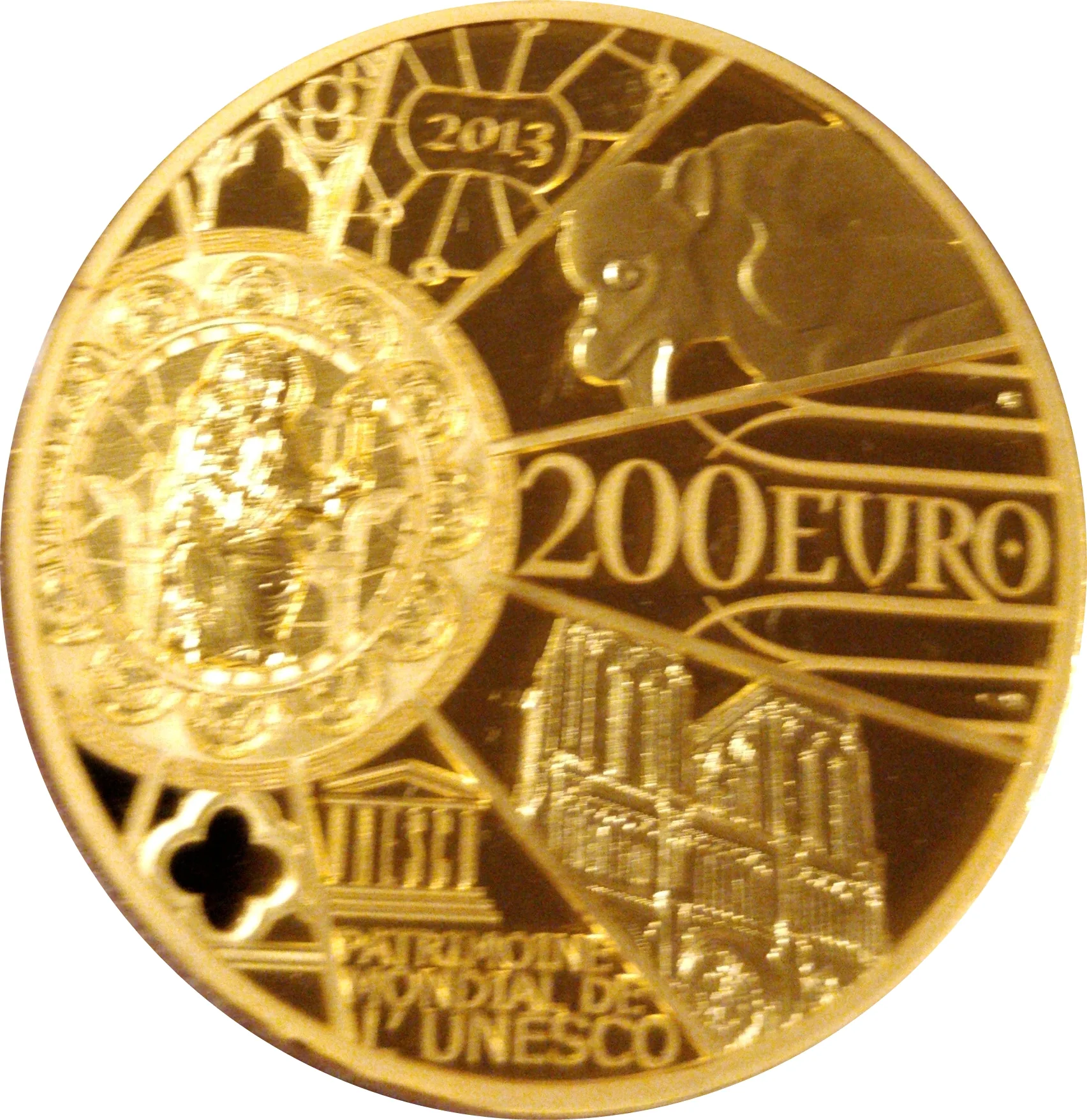 The reverse is similar, with translucent elements visible through both sides. The solid areas show the face value "200 EURO", the year "2013", and the inscription "UNESCO WORLD HERITAGE" with its logo.