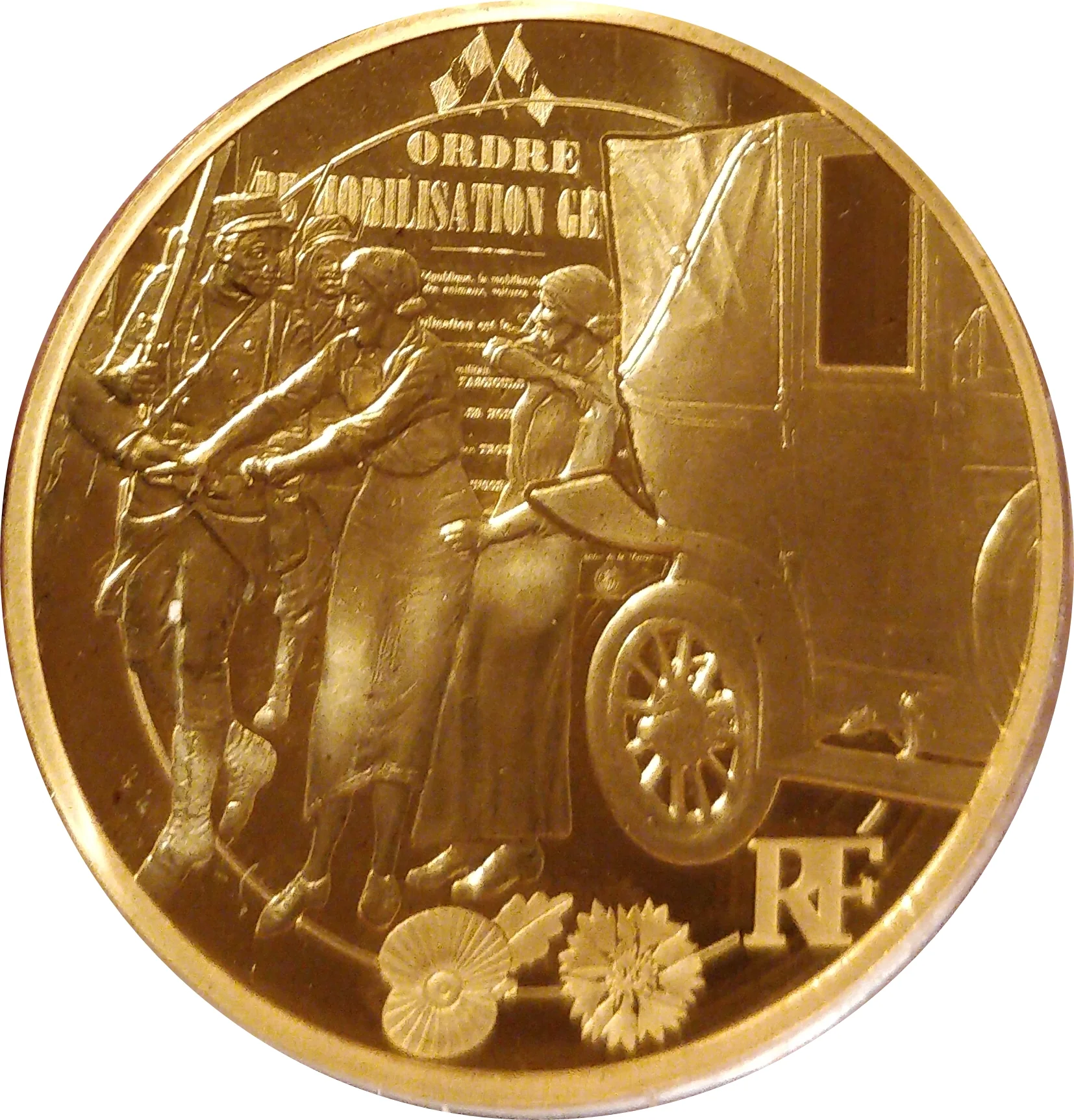 A mobilization order shows men departing for the front. The back of a cab evokes the Battle of the Marne, while a poppy and cornflower honor French and Commonwealth soldiers.