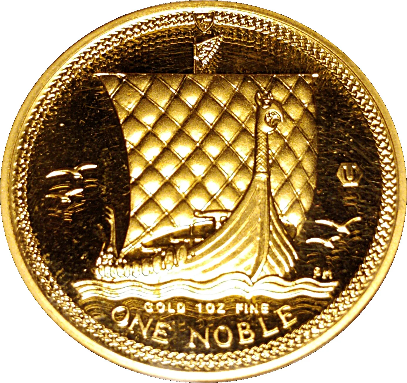 Viking ship sailing on waves, four birds above, value below.