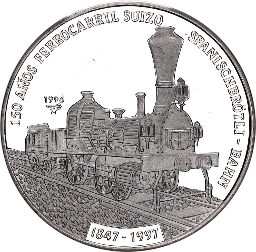 First Swiss train, right. Curved legend above and on sides. Issue date and mintmark left center; years below.