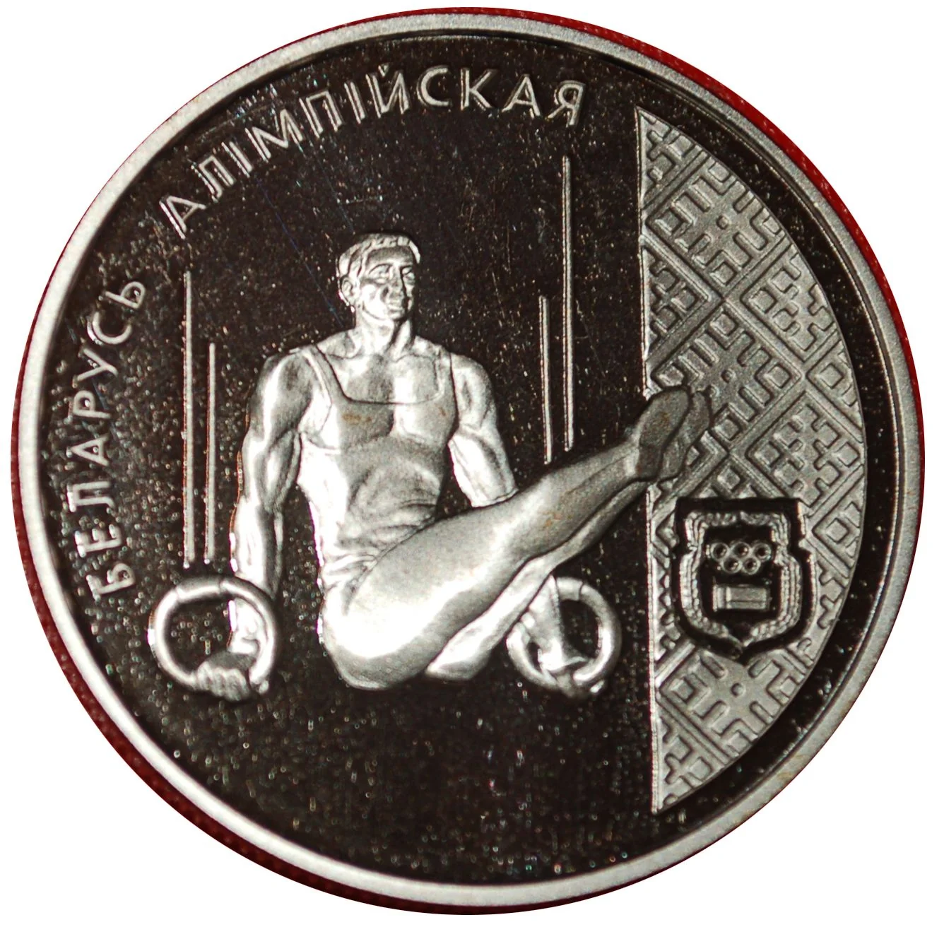 The center features a gymnast on an apparatus; the right side shows the Belarus Olympic Committee emblem on an ornamental background. The rim is inscribed: "БЕЛАРУСЬ АЛIМПIЙСКАЯ" (OLYMPIC BELARUS).