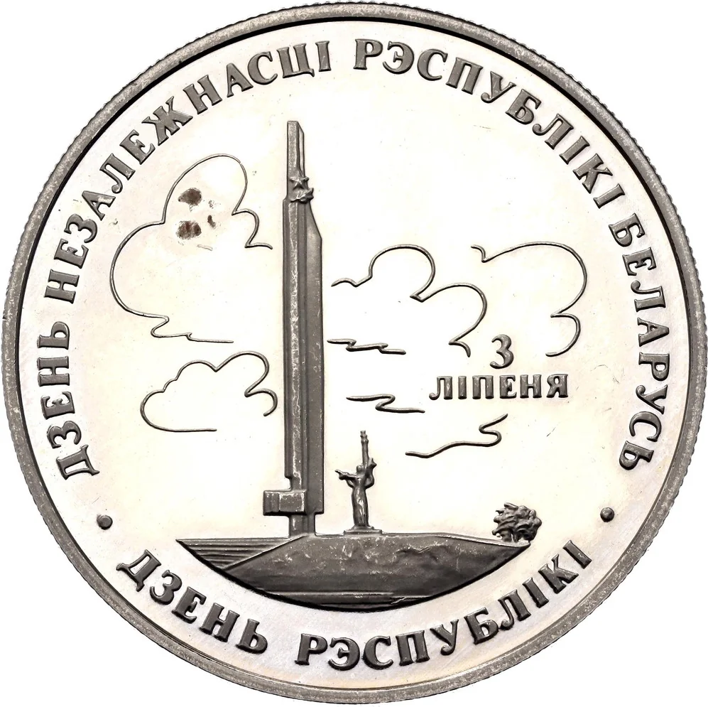 Description: Center: "Hero City Minsk" obelisk relief. Right: "3 ЛIПЕНЯ" (JULY 3). Rim inscriptions: "ДЗЕНЬ НЕЗАЛЕЖНАСЦI РЭСПУБЛIКI БЕЛАРУСЬ" (INDEPENDENCE DAY OF THE REPUBLIC OF BELARUS) and "ДЗЕНЬ РЭСПУБЛIКI" (DAY OF THE REPUBLIC).