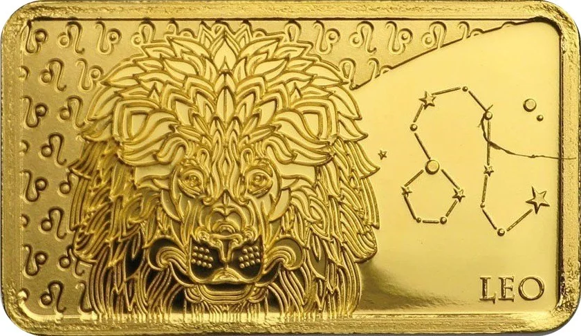 Stylized Leo zodiac sign. Features a lion's head, with its symbol and constellation depicted.