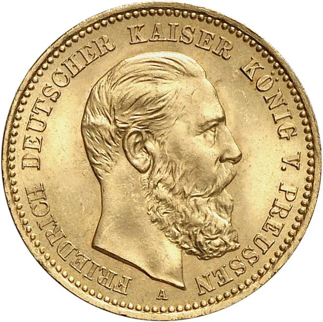 Friedrich III, German Emperor and King of Prussia, facing right. Mintmark below.
