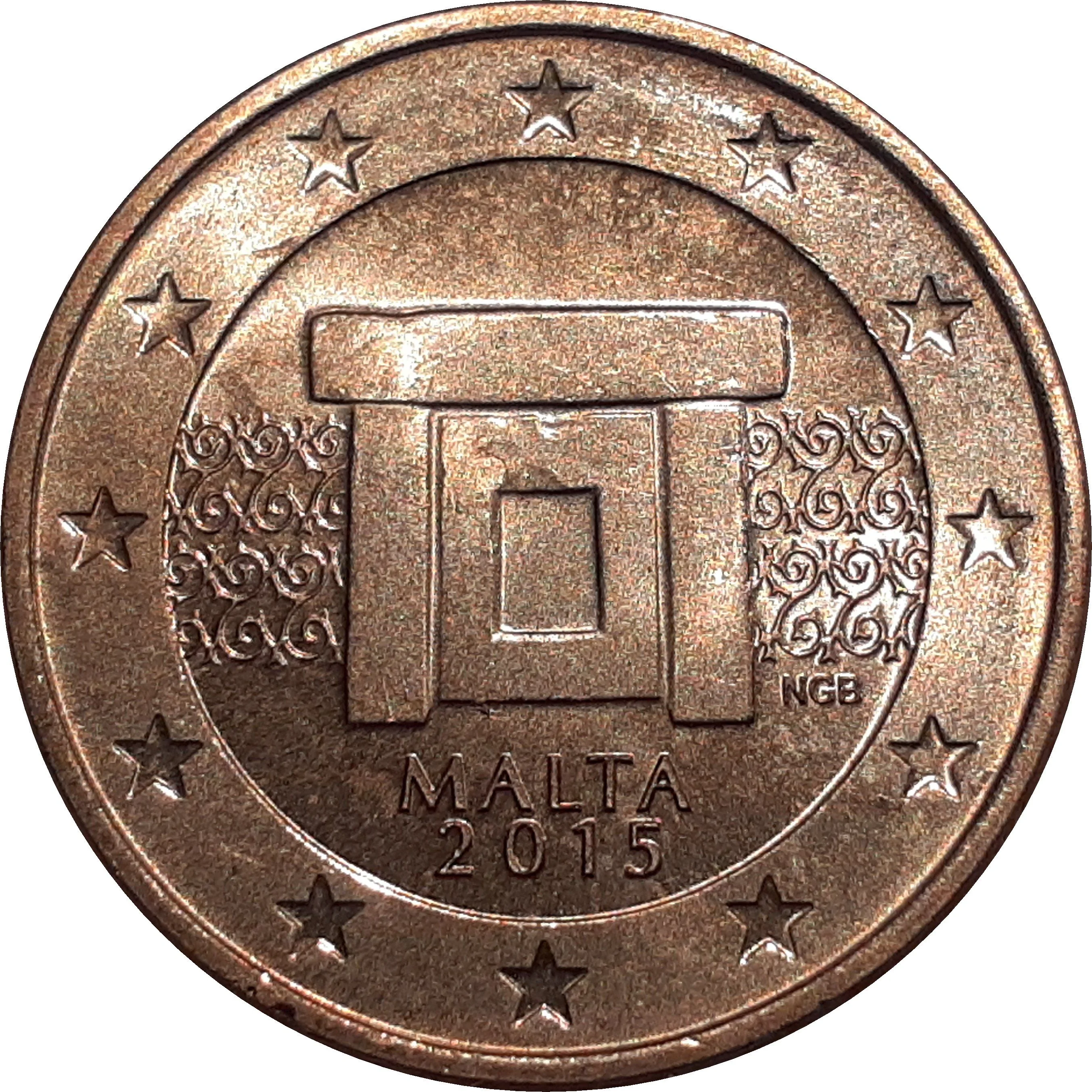 The coin shows the Mnajdra Temple Altar with the country and date, surrounded by the 12 stars of Europe.