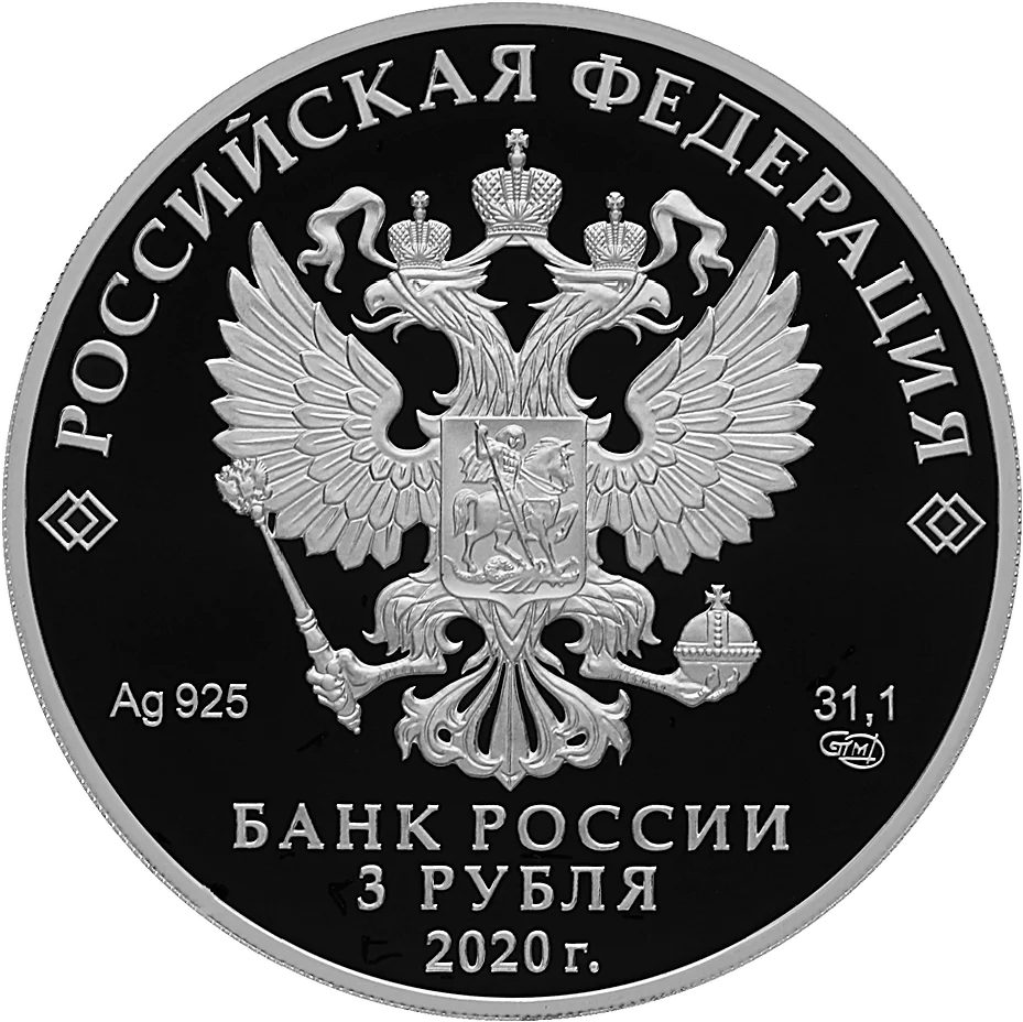 The obverse features the Russian Federation coat of arms with the inscription "РОССИЙСКАЯ ФЕДЕРАЦИЯ" above. Below are the metal specifications and mint mark, with "БАНК РОССИИ", "3 РУБЛЯ", and "2020 г." at the bottom.