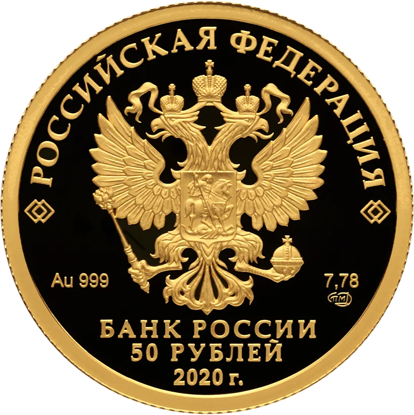 The obverse features the Russian Federation coat of arms with the inscription "РОССИЙСКАЯ ФЕДЕРАЦИЯ" above. Below are the metal specifications, the mint mark, "БАНК РОССИИ", "50 РУБЛЕЙ", and the year "2020 г.".