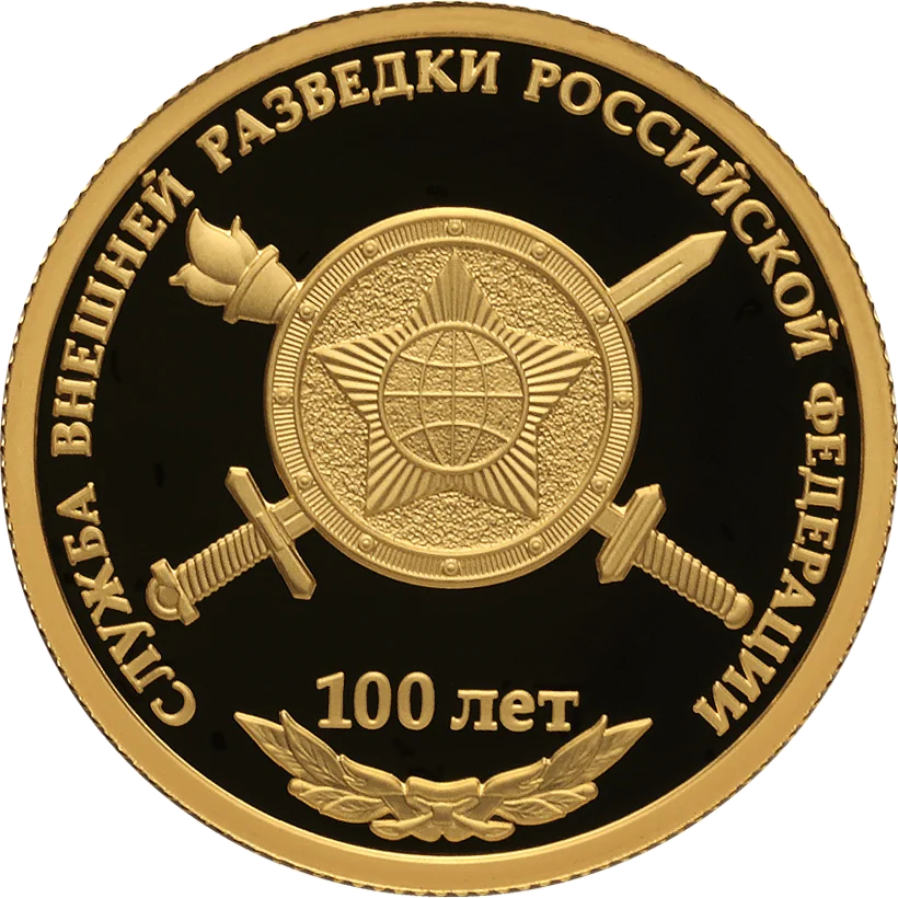 The disc's mirror field features the Foreign Intelligence Service emblem, with 'СЛУЖБА ВНЕШНЕЙ РАЗВЕДКИ РОССИЙСКОЙ ФЕДЕРАЦИИ' around the rim and '100 ЛЕТ' above a laurel branch below.