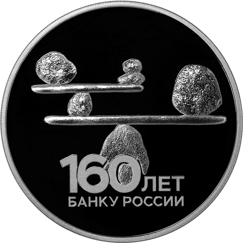 The mirror field features a relief of stones on beams, symbolizing balance, with the inscription: ‘160 ЛЕТ БАНКУ РОССИИ’.
