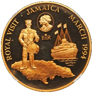 Drummer on Jamaican map left, Royal Yacht right, cameo of Queen and Prince Philip left, monogram top center.