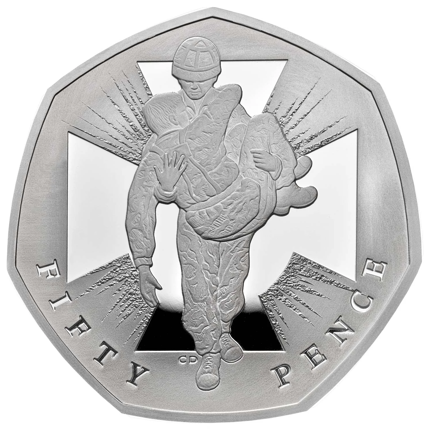 Soldier carrying wounded comrade before Victoria Cross silhouette.