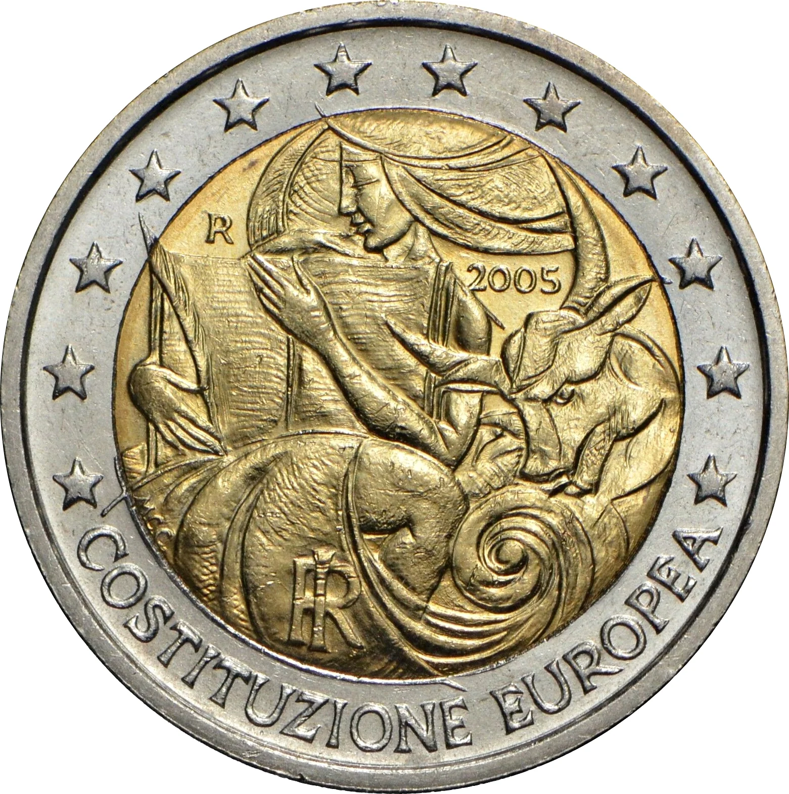 The coin's center shows Europa signing the Constitution, with the mintmark and engraver's initials to the left. The date is above the bull's head, and the Italian Republic monogram is near the bottom with "COSTITUZIONE EUROPEA" below. Twelve stars surround the design in the outer ring.