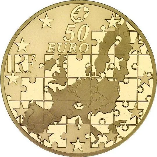 EU map puzzle with 12 flag stars, the top star replaced by a hallmark. Below: "50 EURO" and "RF".
