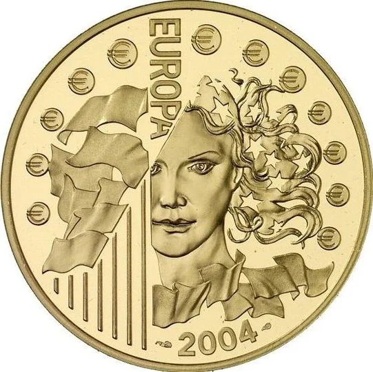 Portrait of Europa with stars in her hair, above an arc of 12 "€" symbols. To her left, European flags on mats.