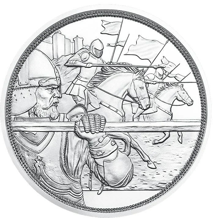 Foreground: a battleaxe. Background: two knights charging with lowered spears.