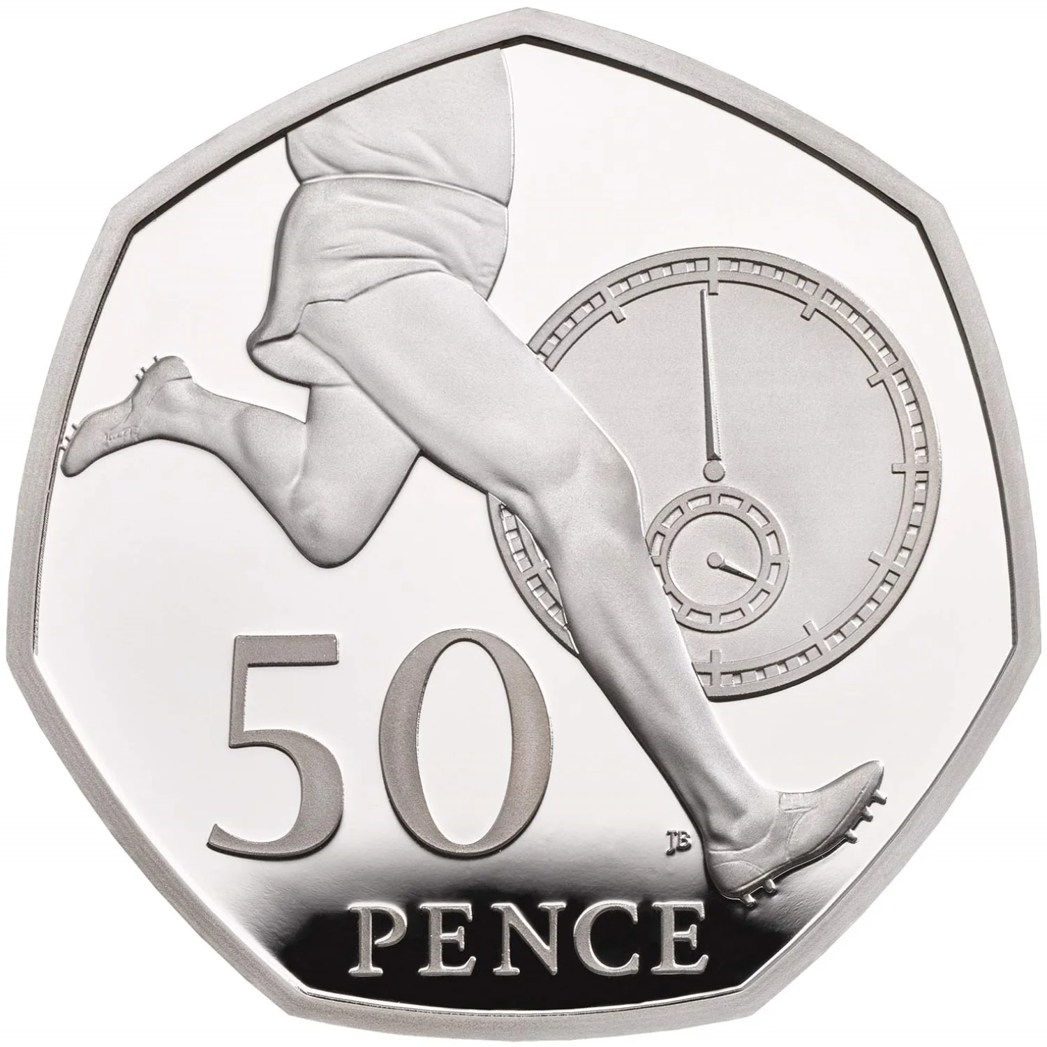 Running athlete's legs with a stylized stopwatch in background, denomination below.