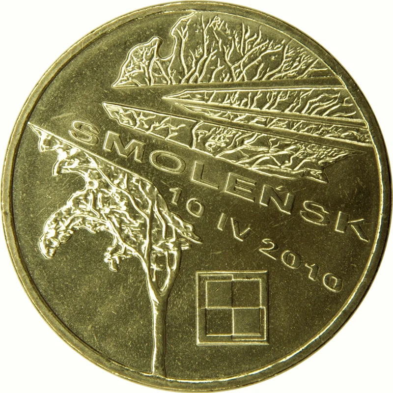 Centered: "SMOLENSK 10 IV 2010". Above, a stylized plane. Below, the plane striking a stylized tree. Bottom right, a frame quartered into small squares.