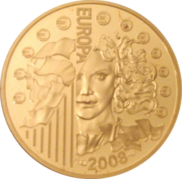 Portrait of Europa with stars in her hair, above an arc of 12 "€" symbols. To her left, European flags on mats.