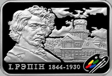 Left: Ilya Repin's self-portrait relief with the inscription "I. РЭПIН" and dates 1844–1930. Right: His Zdravniovo estate museum in Belarus, above a pad-printed palette and brushes.