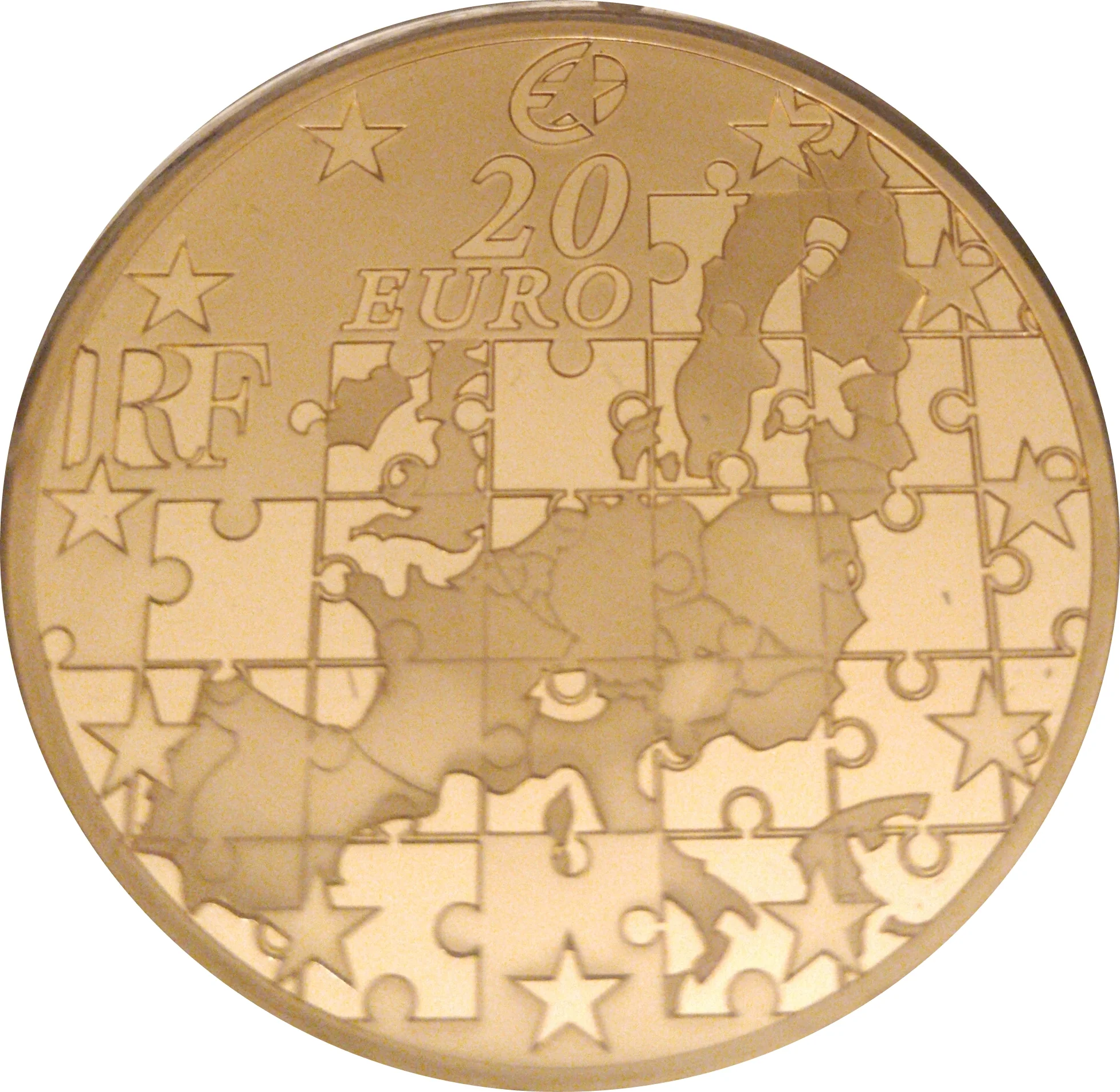 European Union map puzzle with 10 new members, encircled by twelve stars. The hallmark replaces the top star, with "20 EURO" below and "RF" to the left.