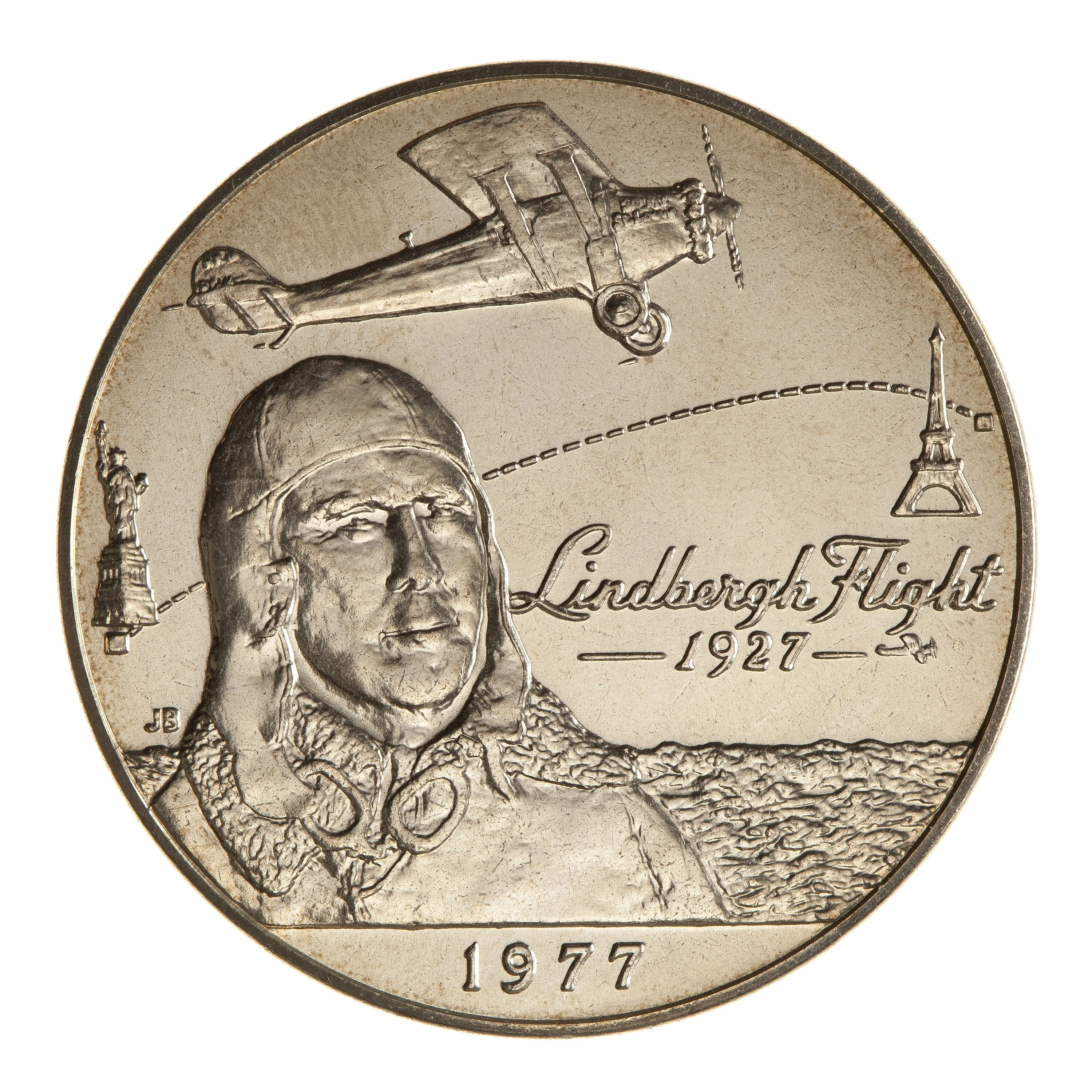 Bust of Lindbergh with his plane and Statue of Liberty left, Eiffel Tower right, ocean behind.