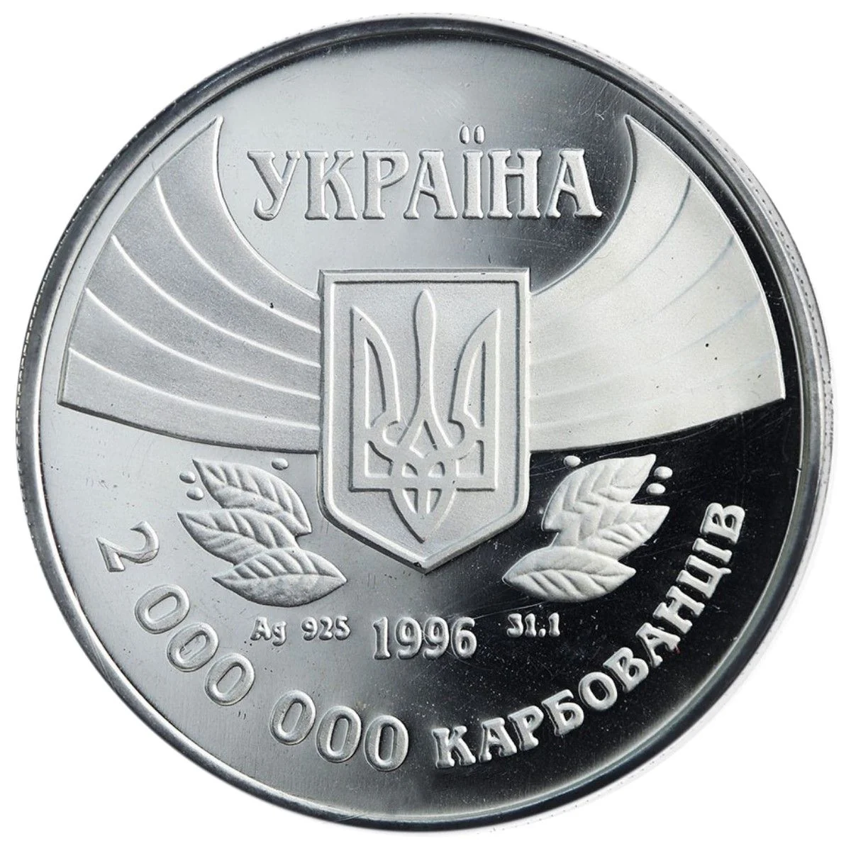 The Small State Emblem of Ukraine is centered, flanked by stylized laurel branches. Above is "УКРАЇНА" and below is the issue year "1996", with "Ag 925" and "31,1" on either side. The circumferential inscription reads "2 000 000 КАРБОВАНЦІВ".