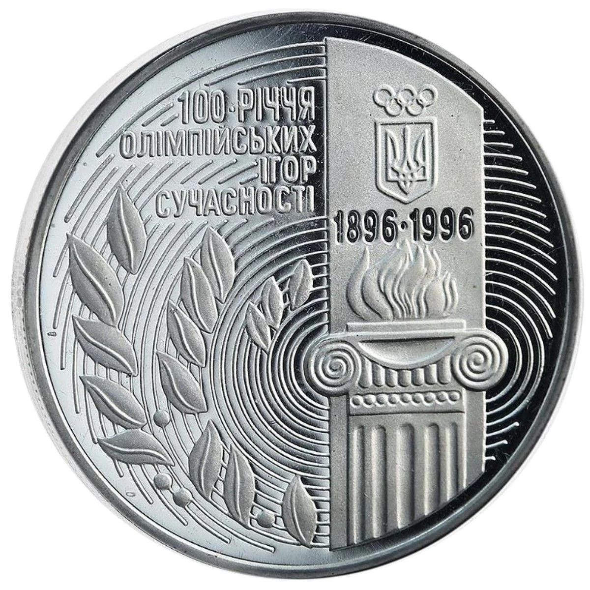 An ancient column fragment with the Olympic flame above its capital. Above the flame are the dates 1896-1996, the emblem of the National Olympic Committee of Ukraine, and the inscription "100-РІЧЧЯ ОЛІМПІЙСЬКИХ ІГОР СУЧАСНОСТІ" with laurel leaves below. The coin's background features lines symbolizing stadium tracks.