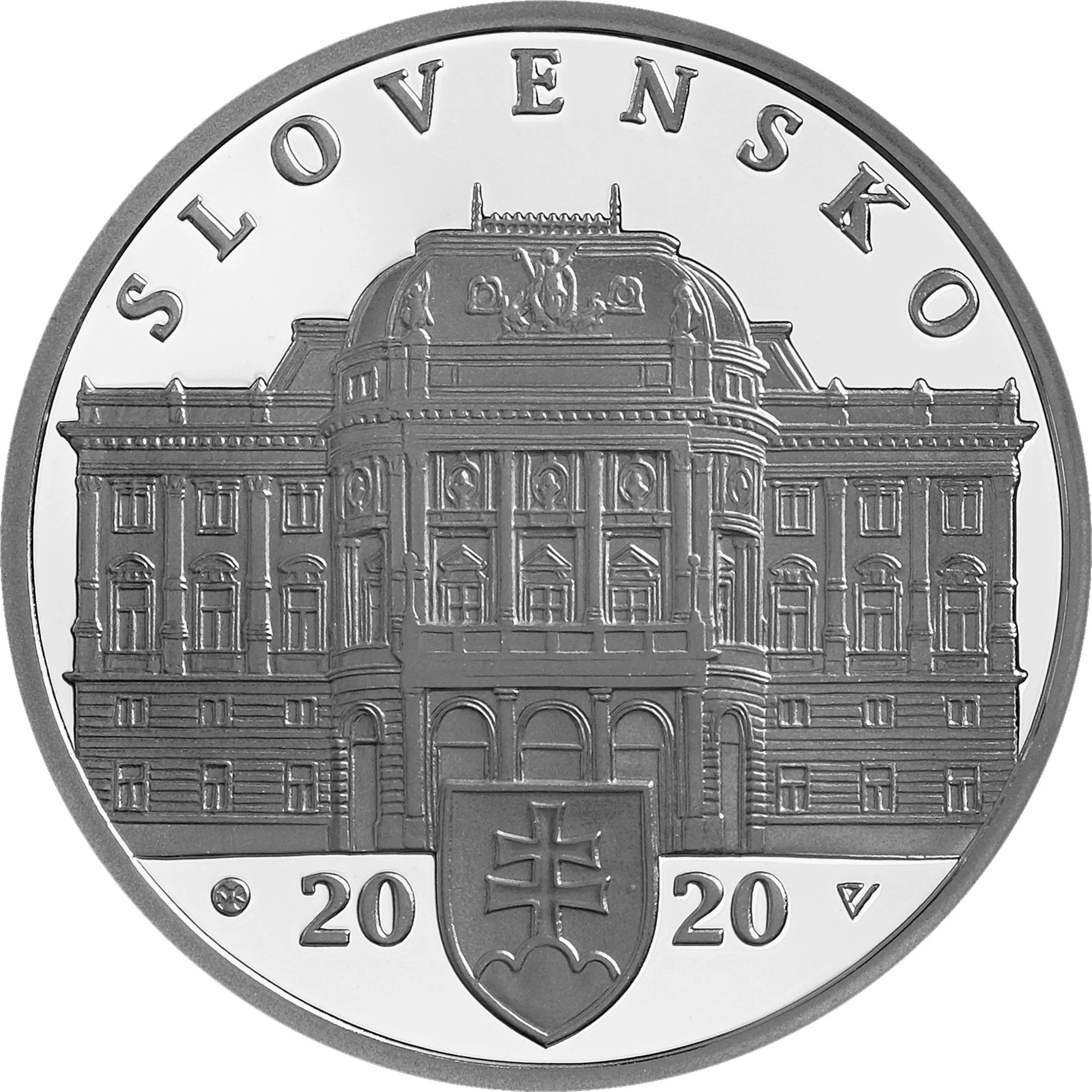 The obverse features the SNT Historical Building, with Slovakia's name above. The Slovak coat of arms at the bottom center splits the year '2020'. To the left is the 'MK' mint mark of the Kremnica Mint, and to the right are the designer's initials 'PV'.