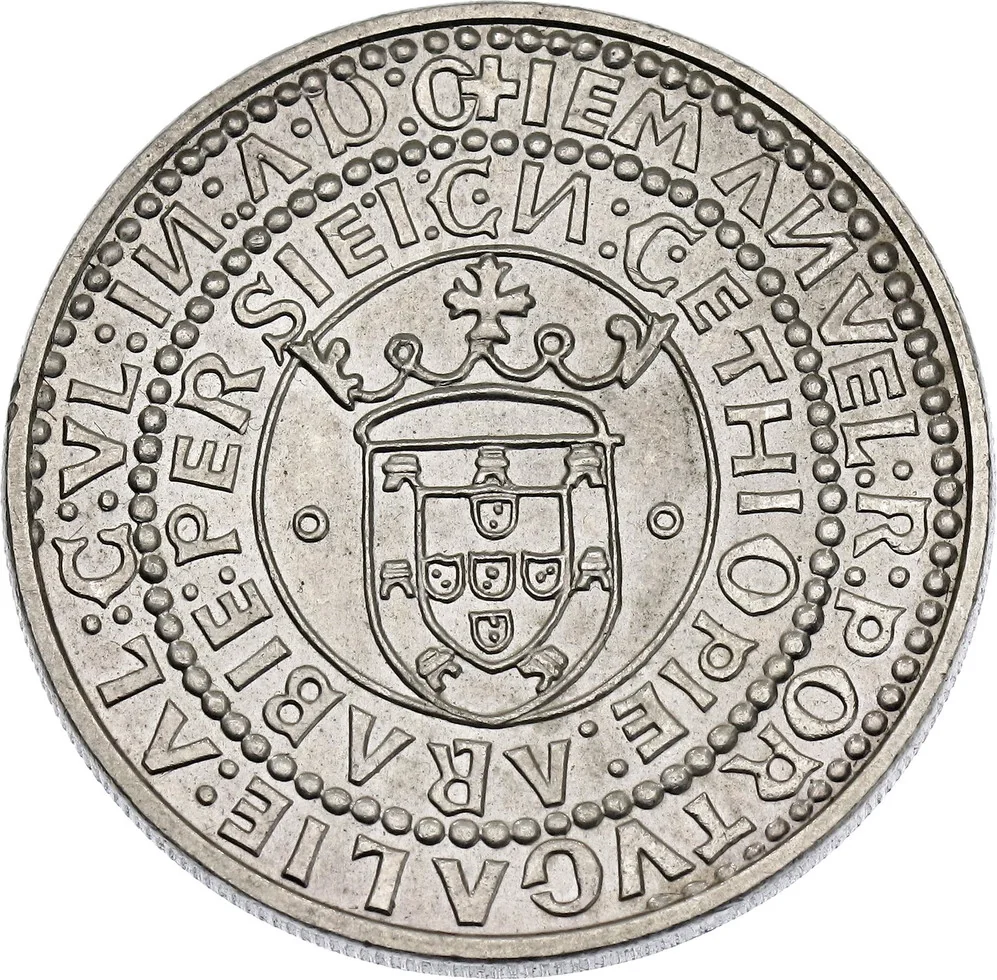 Replica of the obverse of Manuel I's Português de Ouro, featuring the crowned royal shield flanked by annulets within two inscribed circles.
