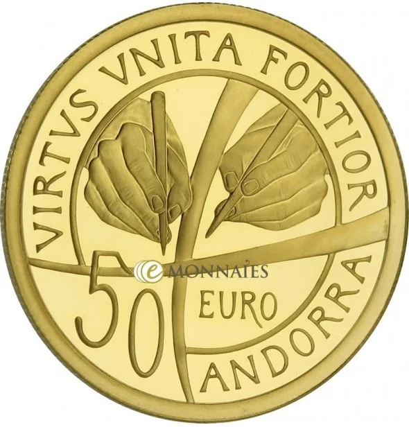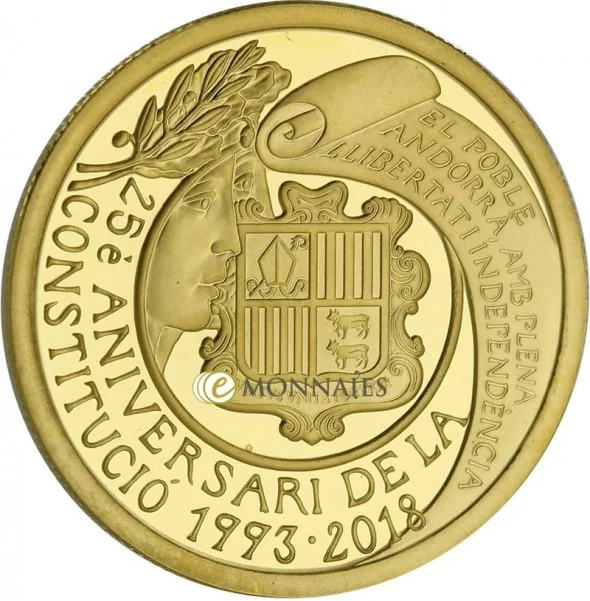 Description: Andorran coat of arms with allegorical figure and laurel branch.