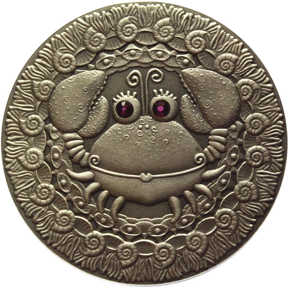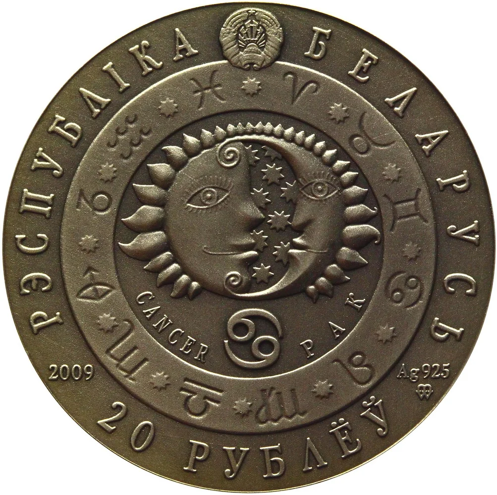 Center: Sun and Moon within the zodiac band, with the sign of Cancer below, labeled "CANCER" and "РАК". Top: Relief of the State Coat of Arms. Bottom left: Year of issue. Bottom right: Alloy standard and Mint of Poland trademark. Circumferential inscriptions: Top — "РЭСПУБЛІКА БЕЛАРУСЬ", bottom — "20 РУБЛЁЎ".