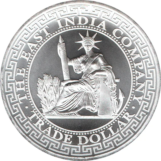 Description: A seated female figure wears a radiant headdress like the Statue of Liberty. To her right, a wheat bale symbolizes Southeast Asia's agricultural bounty; to her left, an anchor represents France's merchant marine. The design is framed by an ornate traditional Oriental border, consistent across all Trade Dollars in the collection.