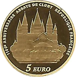 Depiction of Cluny Abbey. Above: "1100e ANNIVERSAIRE ABBAYE DE CLUNY RÉPUBLIQUE FRANÇAISE". Below: "5 EURO".