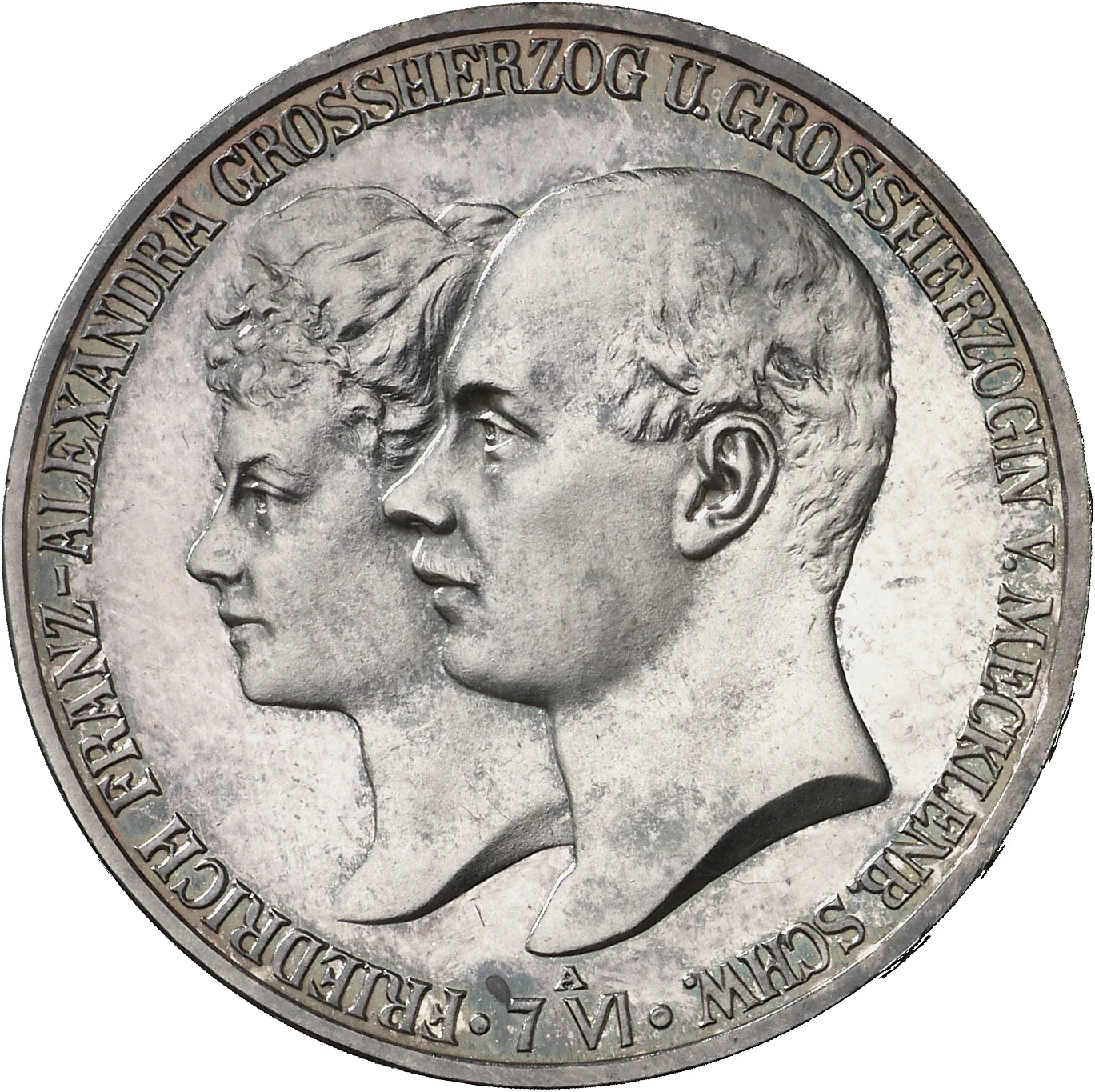 Busts of Friedrich Franz IV and Alexandra of Hanover left, legend encircling.