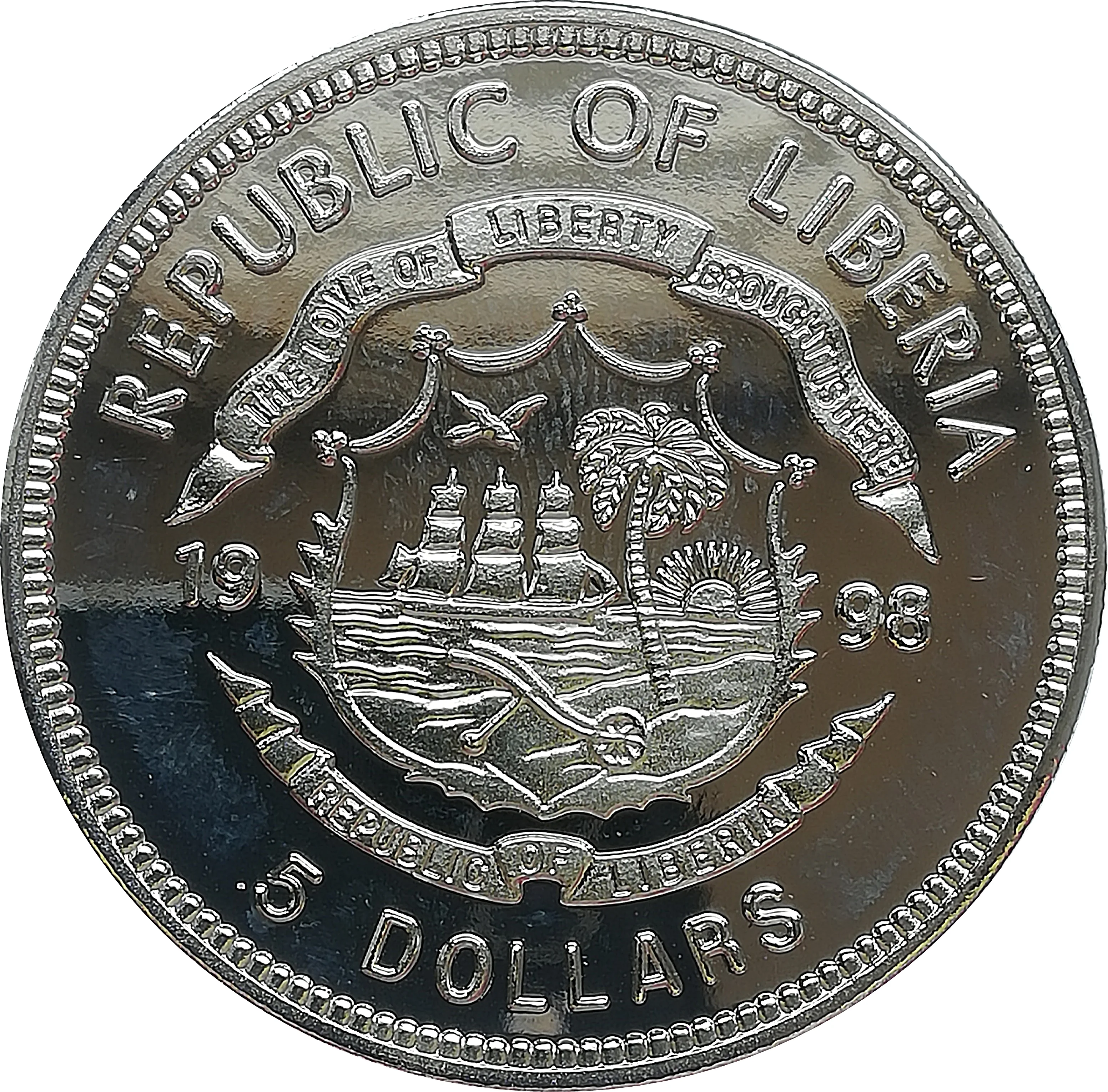 Liberian coat of arms divides date, denomination below.