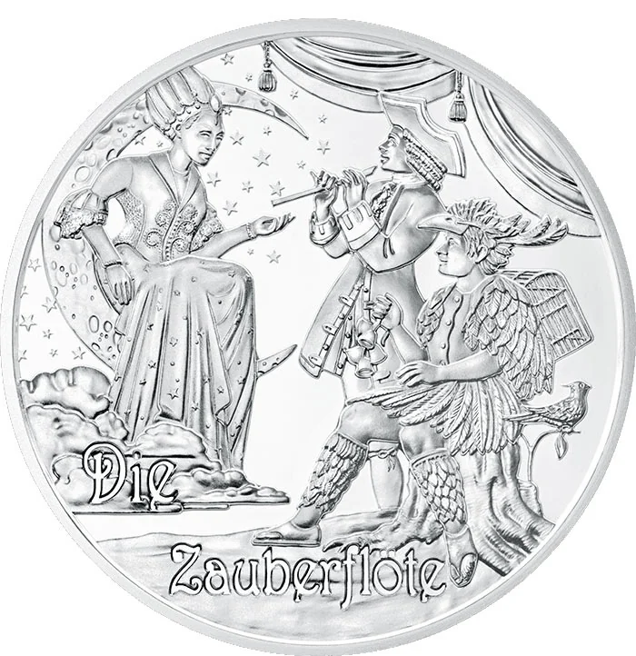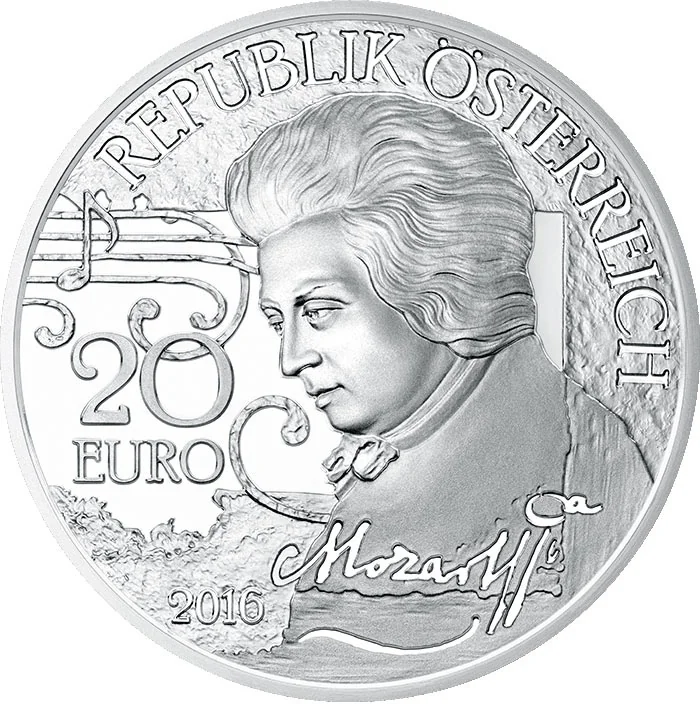 Mozart bust left, musical notes behind. Top: country name, his signature fragment. Bottom: value and year.