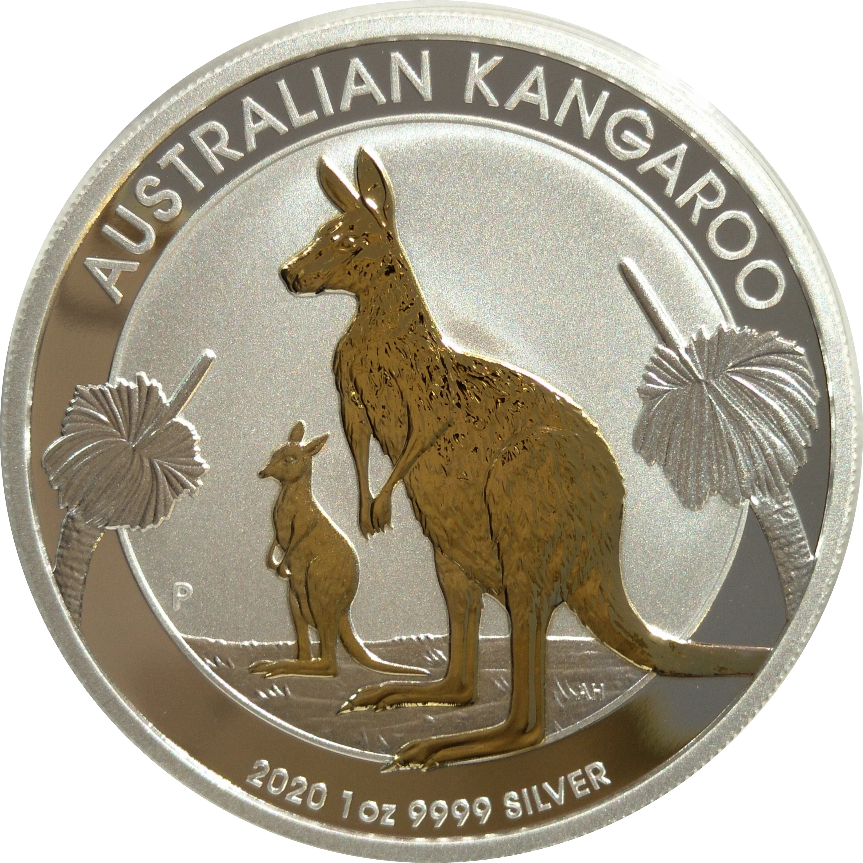 A gilded kangaroo and joey among grass trees, with "AUSTRALIAN KANGAROO," 2020, weight, purity, and the Perth Mint's 'P' mintmark.