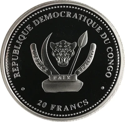 Raised rim, outer beaded circle. Center: Congolese coat of arms above value, within a linear circle.