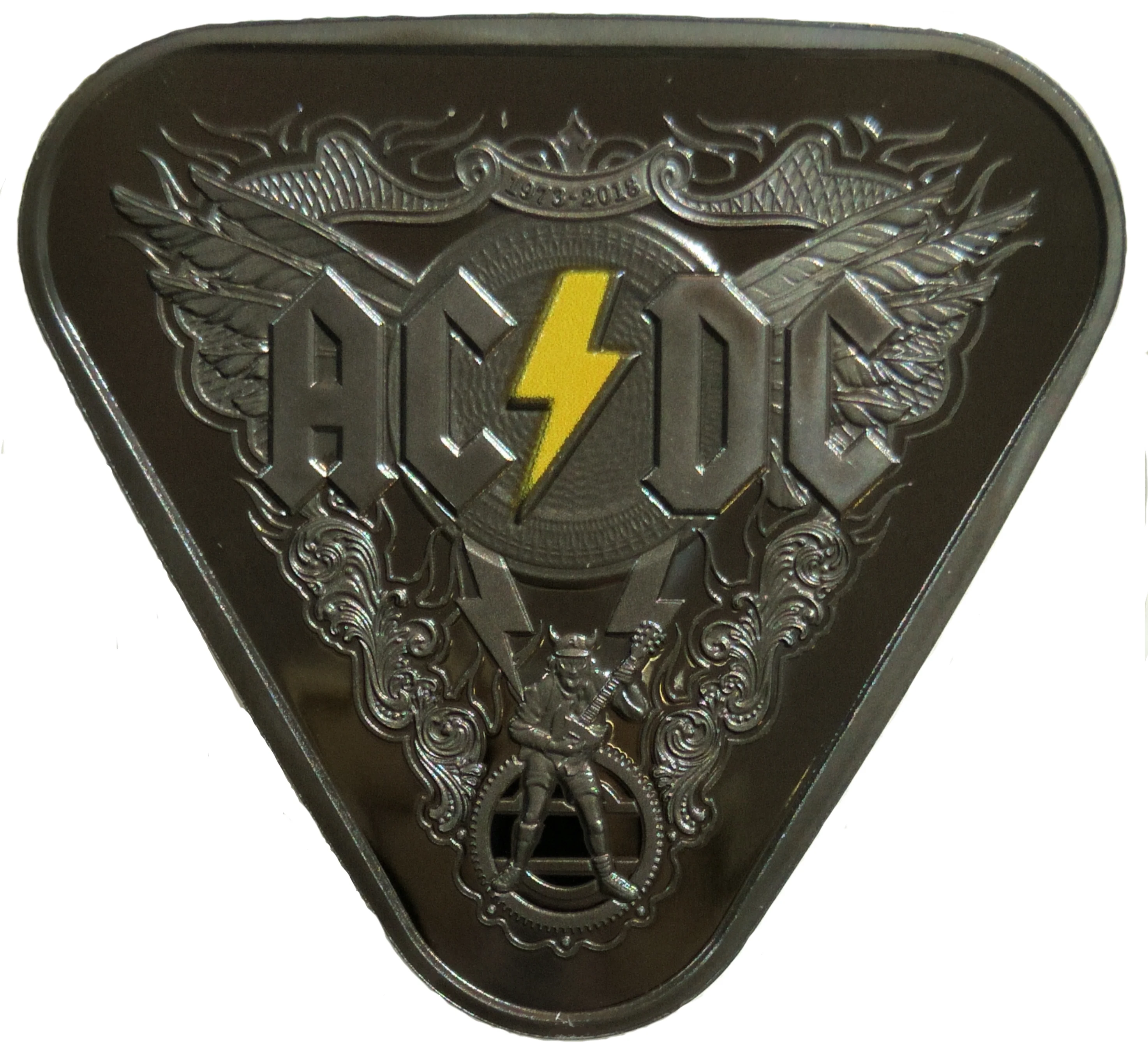 Angus Young of AC/DC, with a yellow lightning bolt between "AC" and "DC," on a shield spanning 1973-2018.