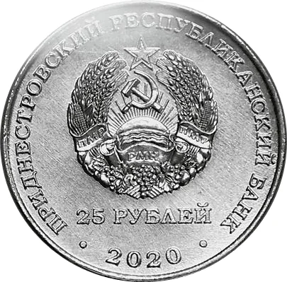 State Emblem of Transnistria. Circular inscription: top - "ПРИДНЕСТРОВСКИЙ РЕСПУБЛИКАНСКИЙ БАНК" (Transdniestrian Republican Bank), bottom - "25 РУБЛЕЙ" (25 Roubles). Below the emblem, the year "2020".