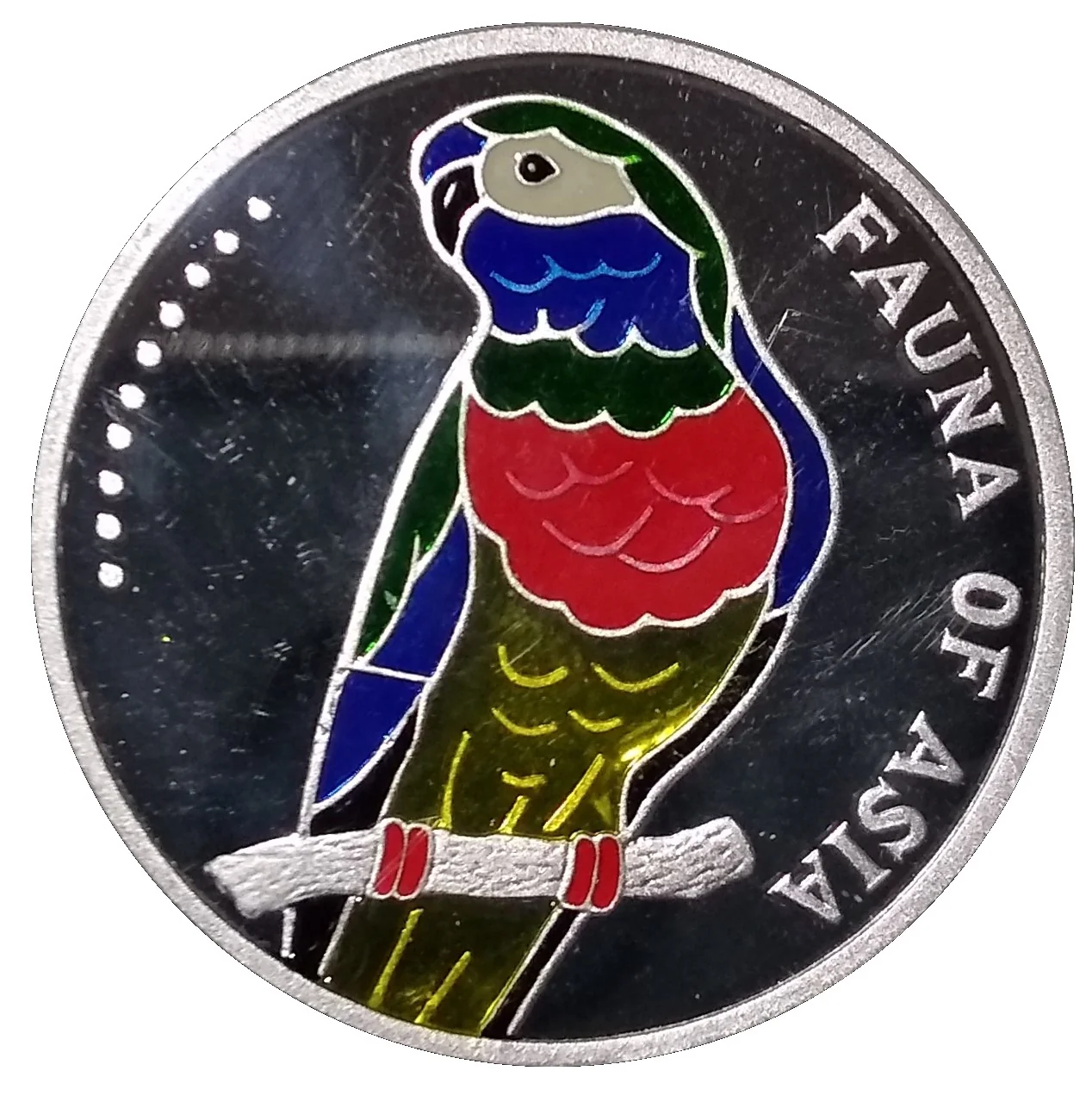Colorful parrot center, Asian fauna right, 10 dots left.