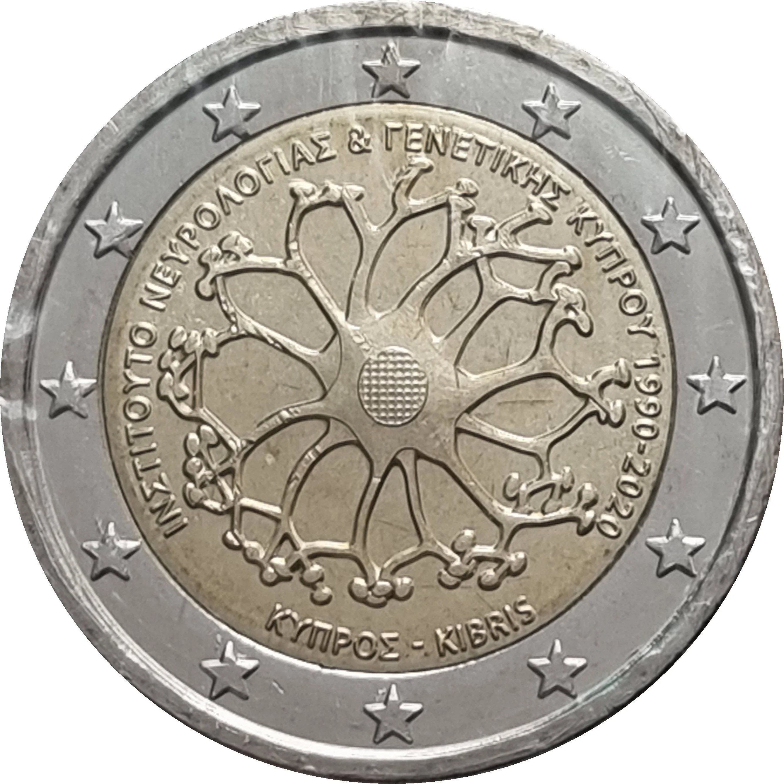 A neuron design symbolizes the Cyprus Institute of Neurology and Genetics on its 30th anniversary (1990-2020). The institute is a center of excellence in services, research, and education. The inscription reads ‘KYΠΡΟΣ - KIBRIS’ and ‘ΙΝΣΤΙΤΟΥΤΟ ΝΕΥΡΟΛΟΓΊΑΣ & ΓΕΝΕΤΙΚΗΣ ΚΥΠΡΟΥ 1990-2020’. The European stars are on the coin’s outer ring.